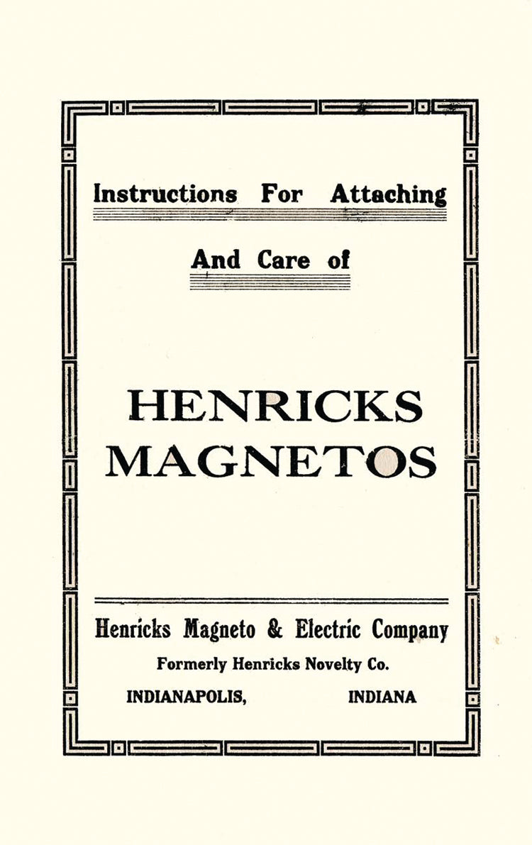 This e-book contains a detailed list of the Henricks Jump Spark Magneto operation instructions, wiring instructions, repair list, and maintenance instructions. Also included are concise diagrams that illustrate the magneto components and how to install the parts. 12 pages.